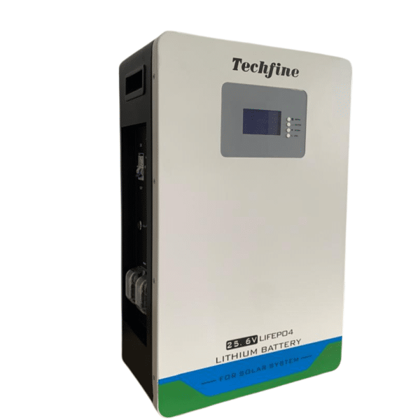 Techfine 5kWh 24V Lithium Battery is a wall-mounted energy storage unit with 5.888Wh usable capacity and 25.6VDC. It features a smart BMS compatible with all hybrid inverters and performs reliably in extreme temperatures.